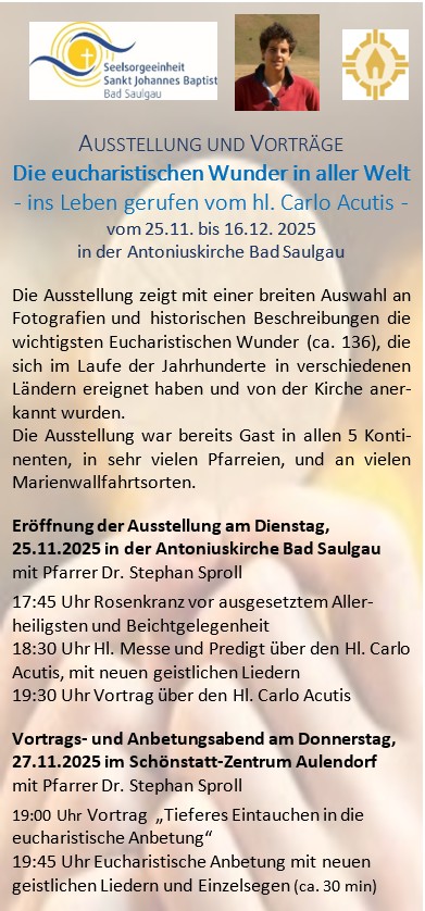 Eine Veranstaltungsreihe in Kooperation mit der Seelsorgeeinheit Bad Saulgau lädt Sie ein in die Welt der Eucharistischen Wunder. Die Ausstellung ist zugänglich vom 25. November bis 16. Dezember 2025 in der Antoniuskirche, Bad Saulgau. Pfarrer Dr. Stephan Sproll hält am 27.11.2025 im Schönstatt-Zentrum Aulendorf dazu einen Vortrag. – Herzliche Einladung